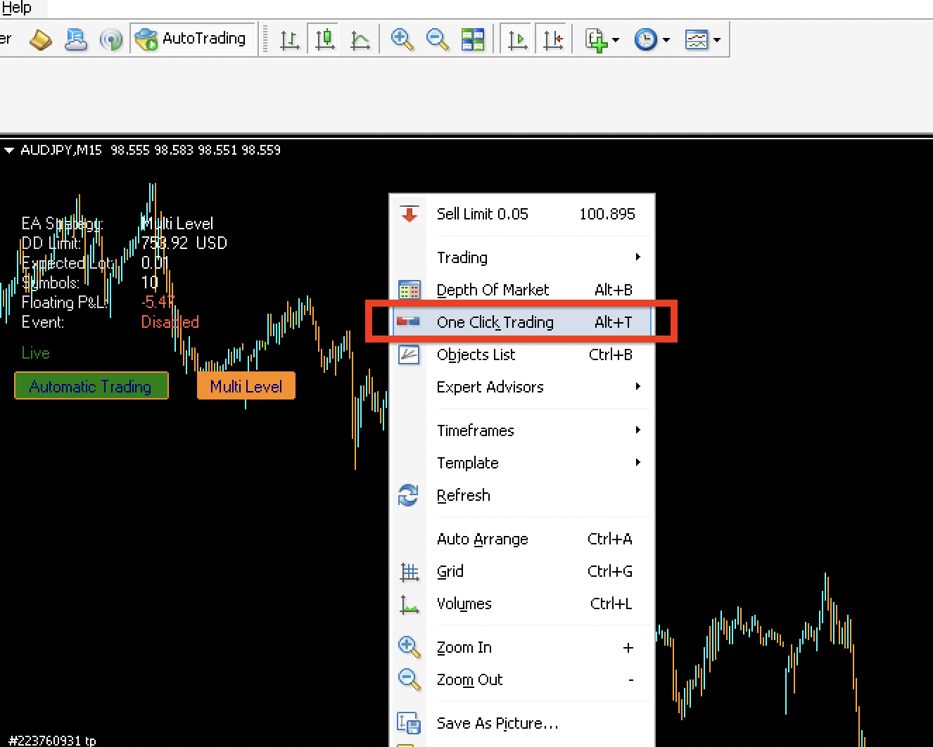 You also need to verify that the pair you’re using is available for trading on your broker’s account. To do this, right-click anywhere on the chart where your bot is installed and select One-Click Trading from the menu. If the option is disabled, it means the pair is not active on your account, and you should contact your broker’s support to request that the pair be enabled for trading.