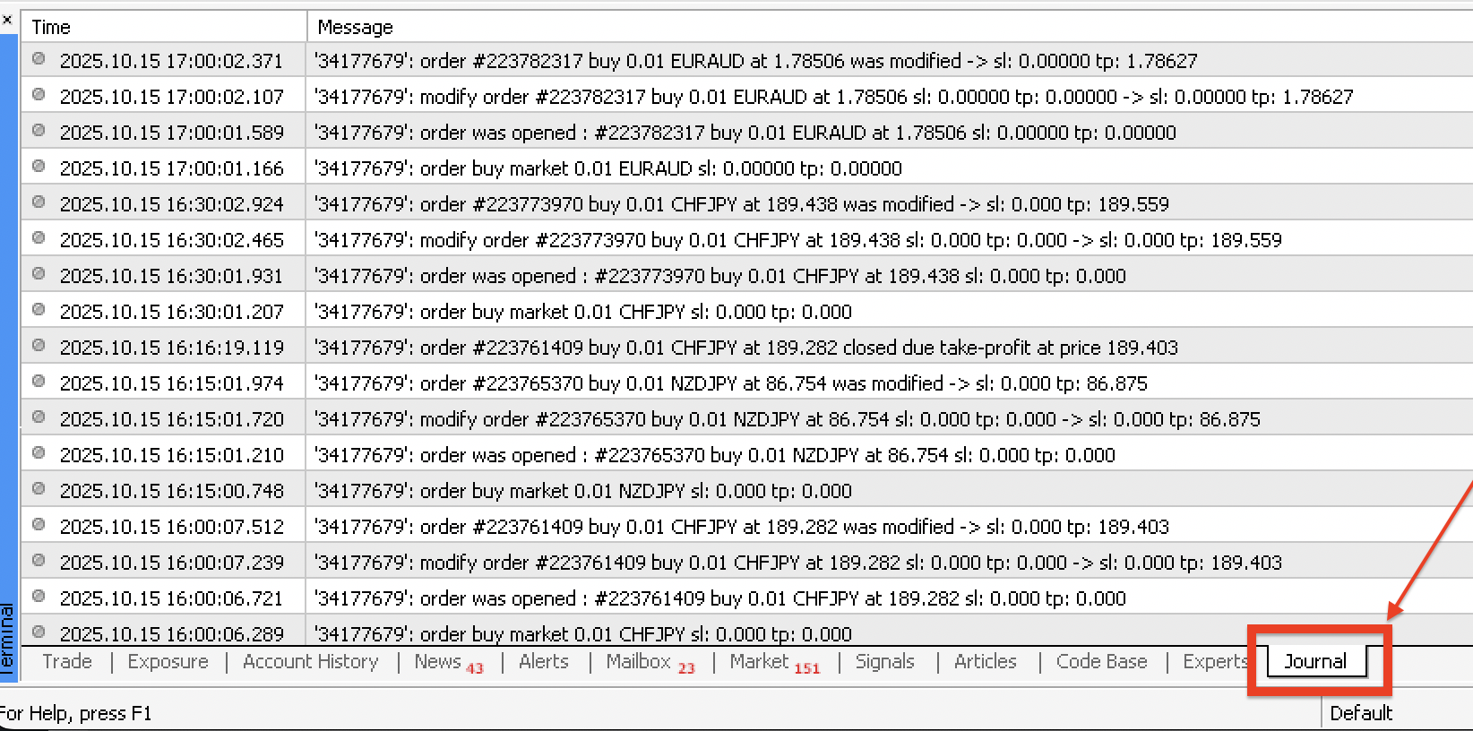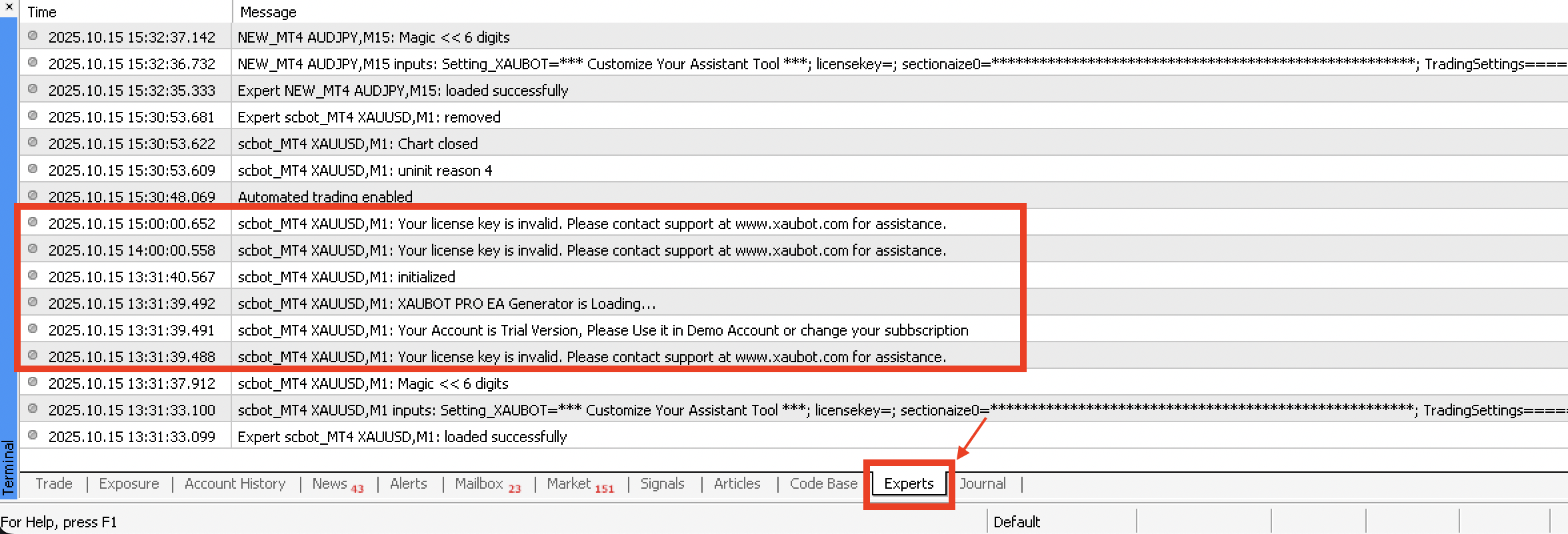 Once your bot is live but hasn’t opened any trades, you should check the tabs at the bottom of your MetaTrader platform — particularly the Experts and Journal tabs. These sections display messages that can help you identify what’s preventing the bot from trading.
