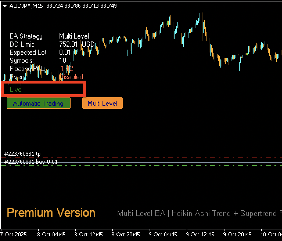 After installing your bot on the MetaTrader platform, the first thing to check is whether the bot displays “Live” on your screen. This indicates that the installation was completed successfully. If you see any error messages instead, it means something wasn’t set up correctly, and you’ll need to review those details to identify and fix the issue.