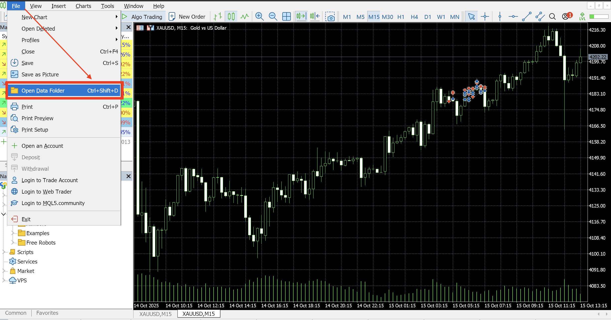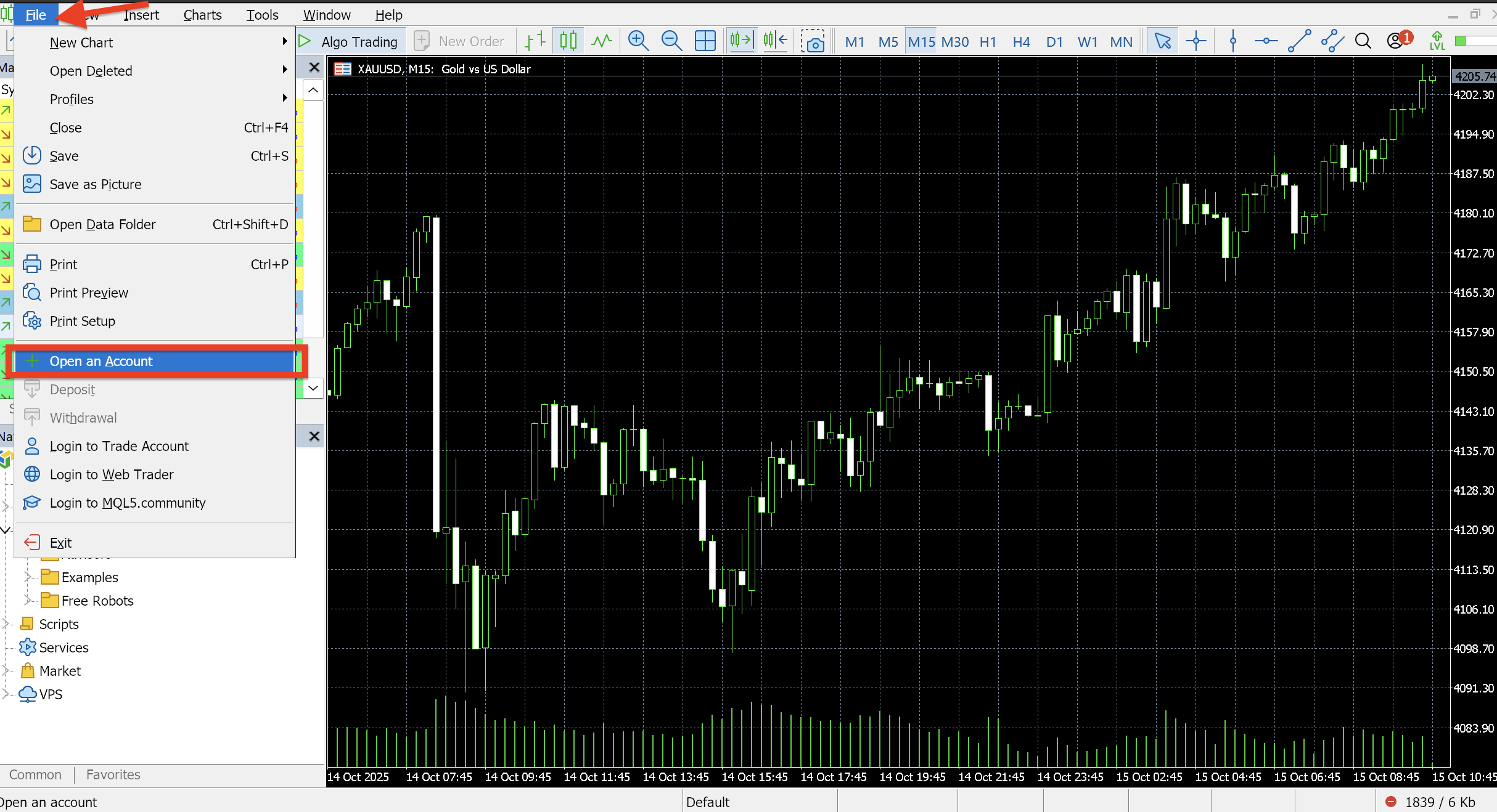 After opening MetaTrader, go to File > Open an Account to log in to your broker account using the credentials provided by your broker when you created it.